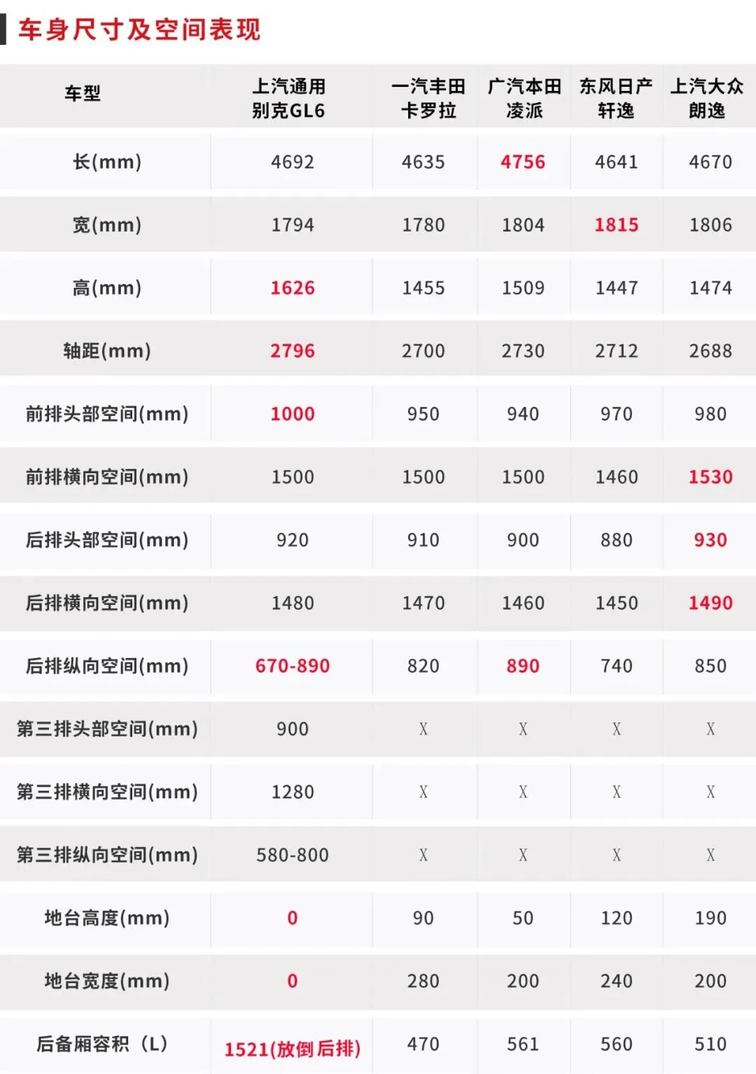 可以看出,虽然在车身尺寸方面别克GL6并没有全面领先,但1626mm的车身高度和2796mm的轴距还是有着比较明显的优势。