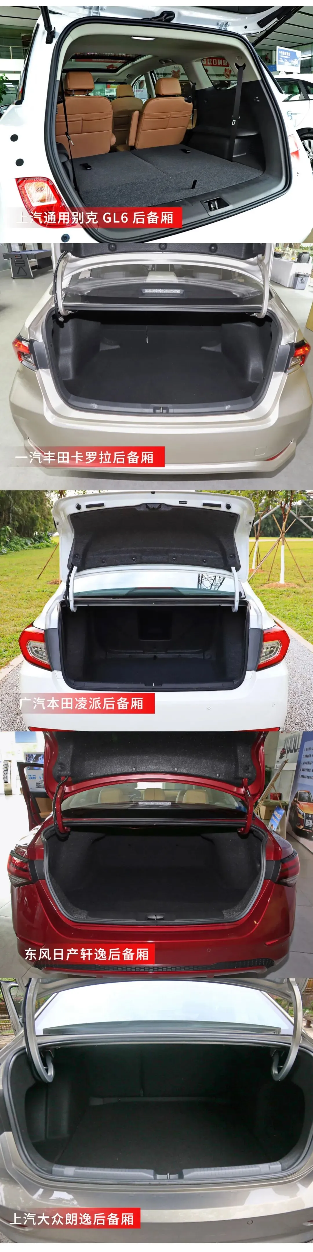在车身长度方面,凌派一马当先,这为它带来了最宽敞的后排纵向空间,同时后备厢容积也是4款轿车中最大的,达到561升。不过,即使是轿车中后备厢空间最大的凌派,也无法和GL6抗衡,放倒第二、第三排座椅后,GL6的后备厢空间达到1521升,并且可以做到纯平空间,装运大件物品会更轻松。