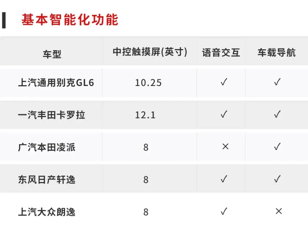 除了空间够大,使用体验也要足够智能,5款对比车型全部配备了触控屏幕,但屏幕内集成的功能却各有不同,以大家最常使用的语音交互、车载导航等功能为例,凌派没有配备语音交互功能,朗逸没有配备车载导航功能,有点小遗憾,其余三款车型的智能化配置则都能满足日常使用需求。