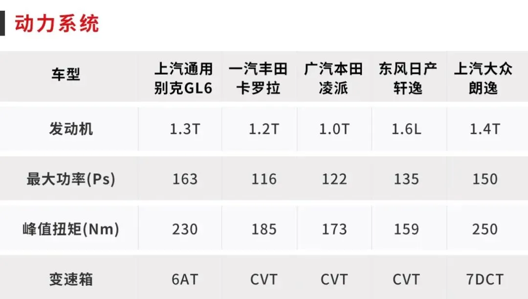 动力系统方面的表现也是消费者购车时关注的重点,动力表现直接关系到日常的驾驶体验。别克GL6搭载的是一台1.3T涡轮增压发动机,最大输出功率163马力,峰值扭矩230牛米,发动机功率是5款对比车型中最高的,发动机峰值扭矩也只是小幅落后于朗逸搭载的1.4T发动机。