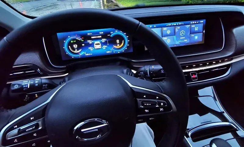 这样试车是非常好的,没有期待就很容易发现惊喜。GA6给我的第一个惊喜,是它的车厢档次。我是入黑之后才去车库里坐上这台车的,它的两个液晶屏,很有档次;中控台的造型观感,很有自己的特色。