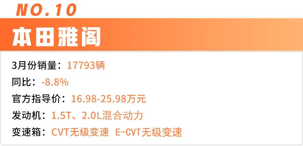 编辑点评:对于一款推出已久的车型,思域仍能保持销量上涨的势头,同比增长55.1%的能力不容忽视。作为神级买菜车的代表,思域的产品竞争力在排名第6的销量里有很好的体现,也成为本田轿车行列中的销量之王。