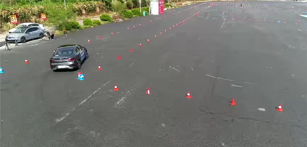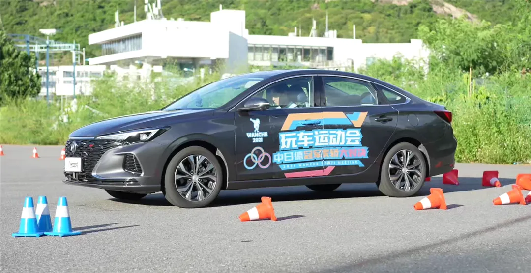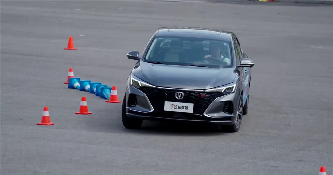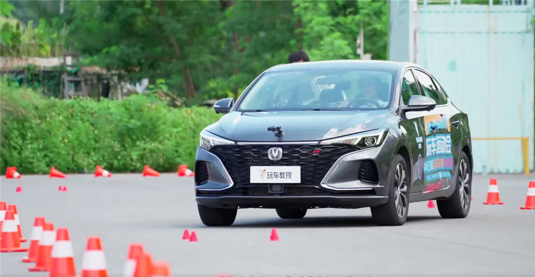 最后一个上场的是长安逸动PLUS,首先轮胎具备不俗的抓地力,再加上方向盘的指向性也很精准,以及灵活的车身响应。所以无论是经过S形弯道、两个直角弯、绕桩,长安逸动PLUS相比其余两者都显得更加从容。