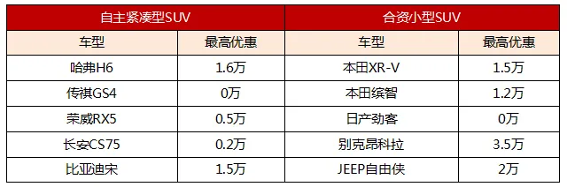 合资小型SUV的优惠比自主紧凑型SUV大得多