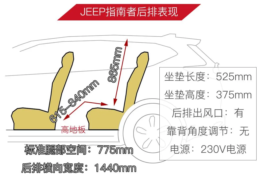 指南者的座椅是这些SUV中最宽大的,375mm的坐垫高度和525mm的坐垫长度都把对手甩开老远,实际乘坐中JEEP车型的座椅也确实很能给人好感,然而在后排头部空间上指南者就有些勉强了,865mm的高度和对手差距很大,如果是坐175cm高度以上的乘客,就会觉得很压抑了,加上较高的地板凸起以及不能调节靠背角度的座椅,指南者的后排表现也是有些遗憾。如果家人身高不超过175cm的话,指南者后排还是十分周到的。