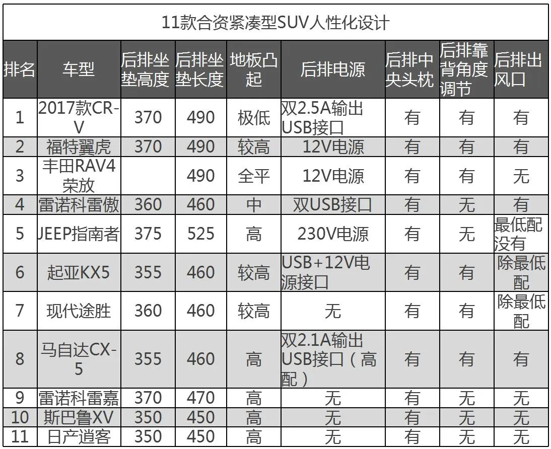 从第六开始的车型硬伤就有一些了,比如途胜和KX5的座椅尺寸偏小,CX-5的腿部空间表现紧凑、科雷嘉、斯巴鲁XV和逍客在人性化配置方面很寒酸,后排待遇很低,由此可见合资紧凑型SUV的后排表现在空间和人性化方面还真有不小差异的,而后排对于家用来说尤其重要,所以买车的时候一定要看准了买哦!