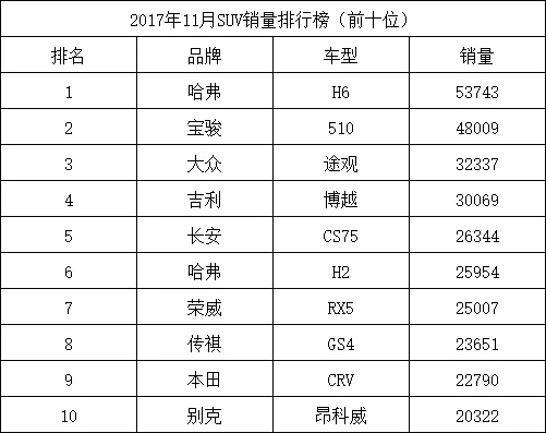在近日,随着各大车企销量的逐渐曝光,11月SUV销量排行榜单也正式出炉: