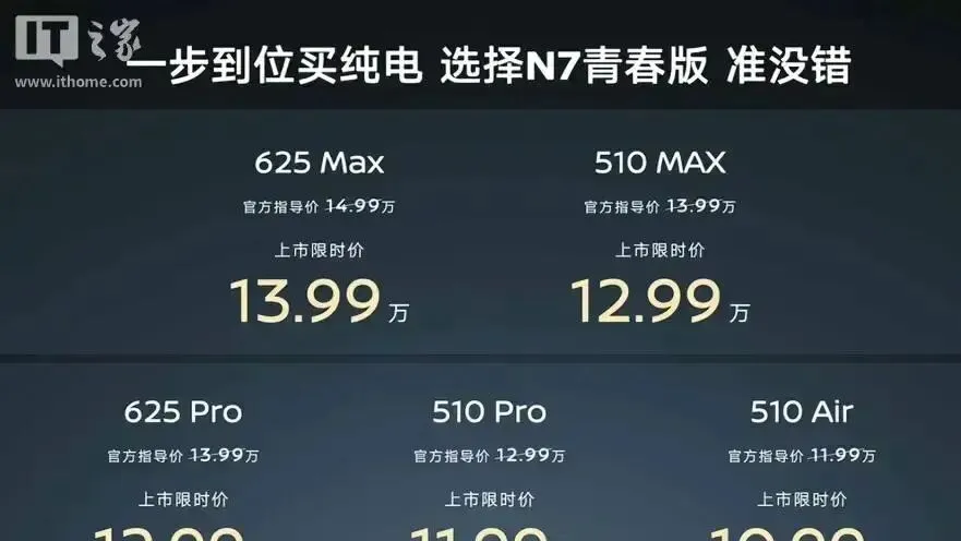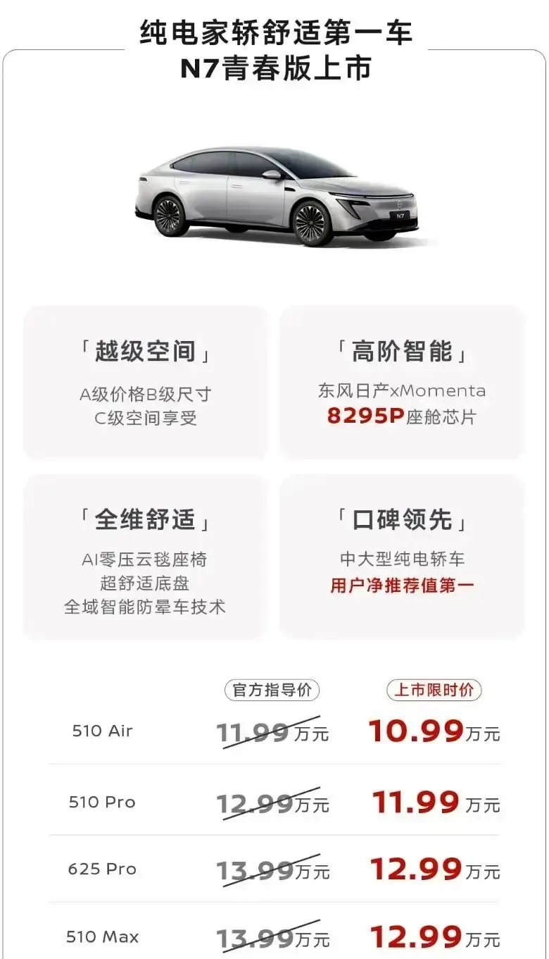 先说结论:东风日产N7青春版真·价格刺客的克星。官方指导价11.99-14.99万,限时价直接砍到10.99-13.99万,续航510km和625km双版本,电机功率160kW/200kW,尺寸大得像移动客厅——4930mm长、2915mm轴距,坐进去脚能伸直。更绝的是,它用的15.6英寸2.5K中控屏,910瓦音响,高通骁龙8295P芯片,玩个游戏丝滑得像摸了WiFi。