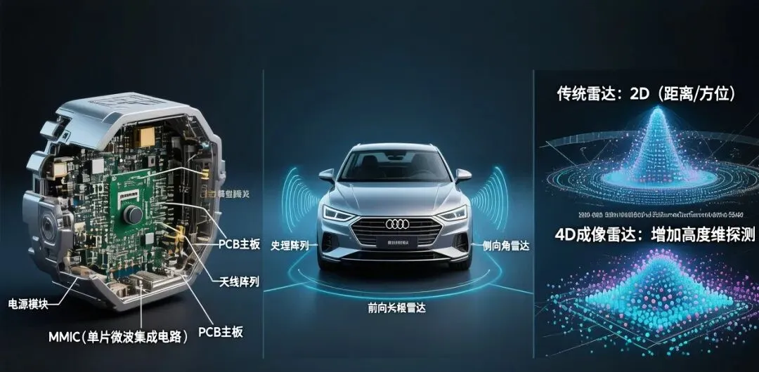 从硬件方案来看,毫米波雷达的核心部件是MMIC毫米波集成电路(技术壁垒最高的部分),它集成了信号发射、接收、放大、混频等所有高频模块,直接决定雷达的探测距离、精度和分辨率;再搭配雷达整流罩(透波高分子材料,抵御灰尘水汽)、PCB信号处理板、压铸散热底板和高速连接器,构成完整的感知单元。