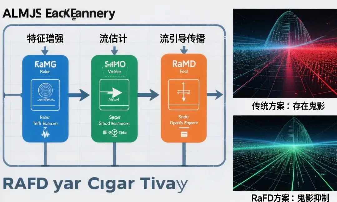 RaFD方案的核心目标,是解决原始雷达图像的噪声和“鬼影”伪影问题(雷达信号反射产生的虚假目标),通过建模几何运动线索,提升纯雷达感知的精度和可靠性。其核心技术逻辑的是:估计帧间鸟瞰图(BEV)流,利用几何线索引导特征传播,让雷达能精准区分真实目标和虚假信号。