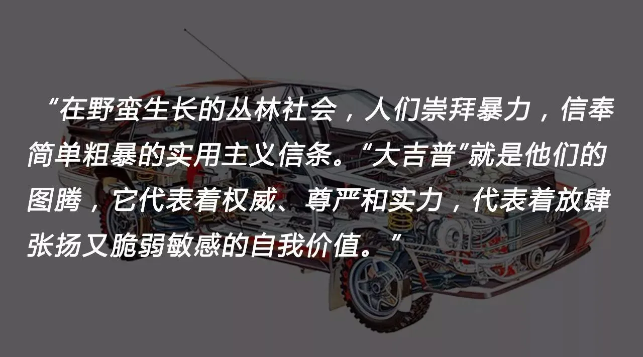 在野蛮生长的丛林社会,人们崇拜暴力,信奉简单粗暴的实用主义信条。“大吉普”就是他们的图腾,它代表着权威、尊严和实力,代表着放肆张扬又脆弱敏感的自我价值。