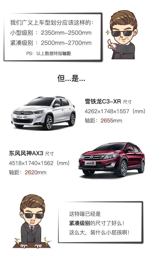 而小型SUV热卖还有一点不能忽视的理由那就是...这特么还能叫小型SUV么?就好像雪铁龙C3-XR(车长4262mm,轴距2655mm),东风风神AX3(车长4518mm,轴距2620mm),这要放到一般的标准,早就是紧凑型车的级别了啊!