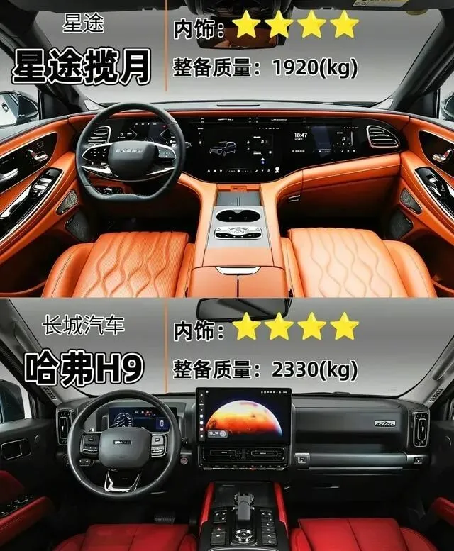 坐进车里的感觉,俩车的差异就更明显了。揽月的内饰是真舍得用料,大面积的橙色皮质包裹,缝线做得跟高档沙发似的,细节处理得很精致。双联屏加上怀挡的设计,科技感一下子就拉满了,坐进去不像是在开车,倒像是进了间小客厅,豪华氛围营造得挺到位。H9就不一样了,红黑配色,线条硬朗,中控屏尺寸不小,但保留了很多物理按键,空调旋钮、座椅加热这些常用功能,伸手就能摸到,不用低头在屏幕里划拉半天。这种风格更适合那些喜欢机械质感、觉得开车就得有点“掌控感”的人。简单说,揽月是让你舒舒服服享受旅程,H9是让你清清楚楚知道自己在操控一台机器。
