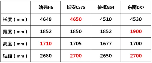 车身宽度方面,哈弗H6、长安CS75、传祺GS4、东南DX7分别为1852mm、1850mm、1852mm、1900mm,其中DX7的1900mm也是完爆对手,因此实际体验,DX7后排横向空间也是最宽适的。