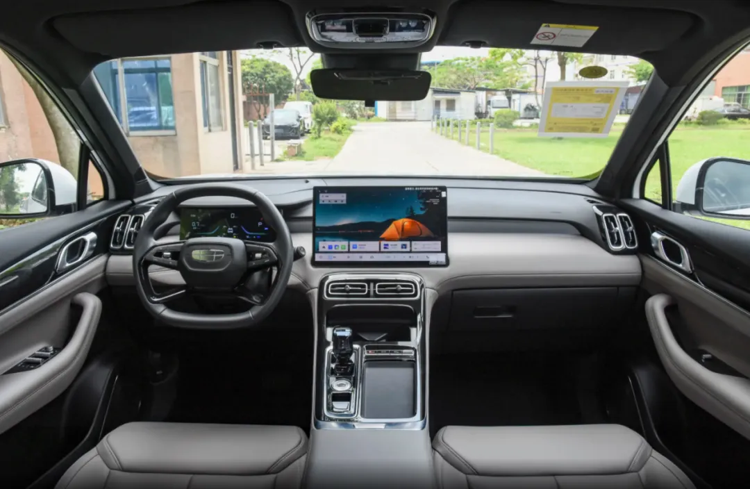 坐进车内之后,这台第四代的吉利博越L的内饰布局确实要比老款顺眼许多,特别是横向布置的中控屏幕。而且值得一提的是,该车还配备了Flyme Auto系统,中配及以上的版本还拥有龍鹰一号车机芯片,所以整个车机系统的操作流畅度和功能性也都有明显提升。除此之外,该车的仪表台以及出风口造型也都有调整,再加上大面积的皮革包覆和钢琴黑饰板等元素点缀,也进一步提升了车内的档次感。