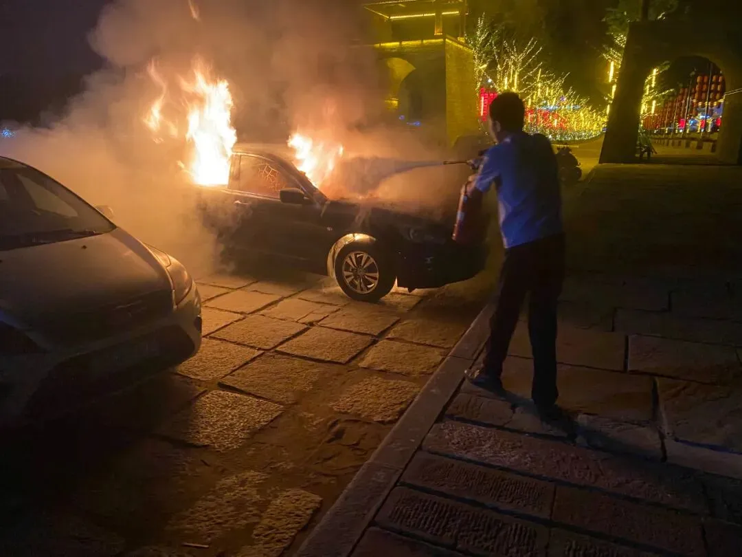 5月15日晚,一游客驾车前往南丰县洽湾古镇游玩,不久其轿车自燃起火,该游客报警求助。