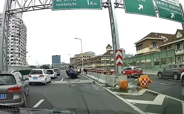 据市民介绍,当时一辆轿车撞上南北高架往宝山方向主线与转内环高架匝道之间的防撞桶,造成多个防撞水桶移位、损坏。现场有一辆轿车侧翻,另有两辆事故车停在主线二号车道上。