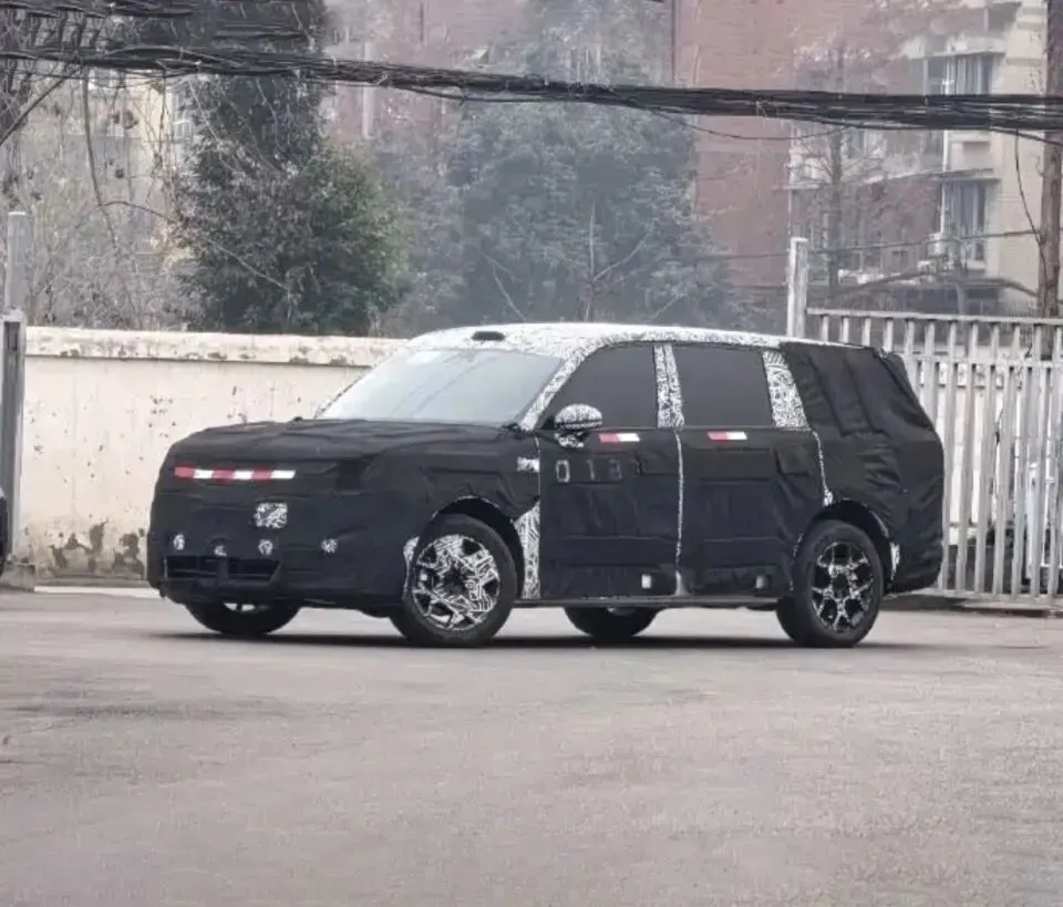 来到车身侧面,线条规整硬朗,贯穿式腰线从车头延伸至车尾,勾勒出修长大气的车身姿态,外扩的轮拱进一步强化硬派气场,搭配大尺寸密辐式轮毂,兼顾豪华感与通过性。此次谍照重点曝光了车尾细节,车尾采用方正造型,竖向排列的LED尾灯组位于车身两侧,中部预留贯穿式灯带位置,车顶延伸出小型扰流板,整合了高位刹车灯,尾门疑似采用“天地门”设计,牌照区域位于尾门下半部分,兼顾实用性与辨识度,整体设计与车身硬朗风格高度契合。