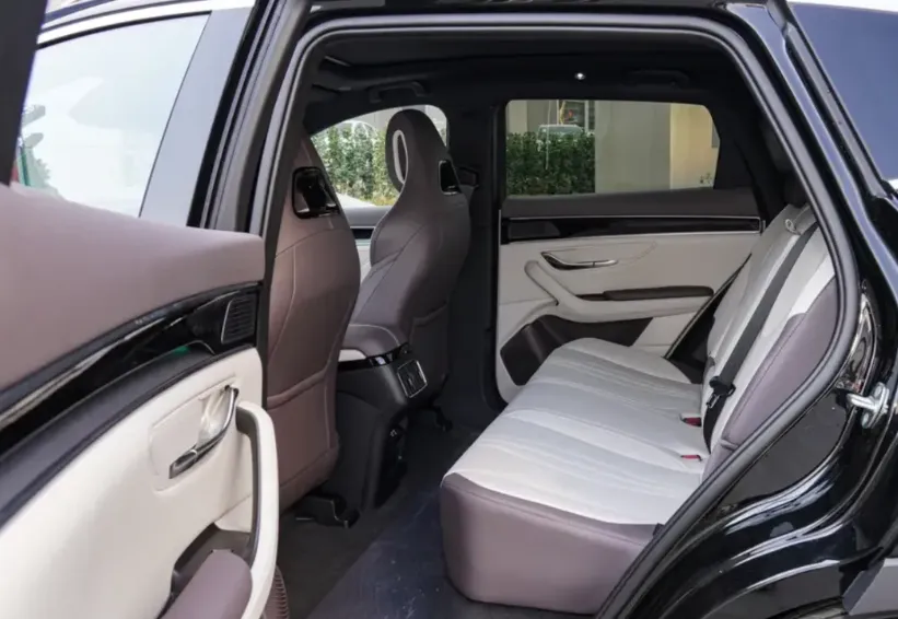后排质感也很高级,烤漆饰板、双色皮革、镀铬门把手,透着商务感和豪车韵味。