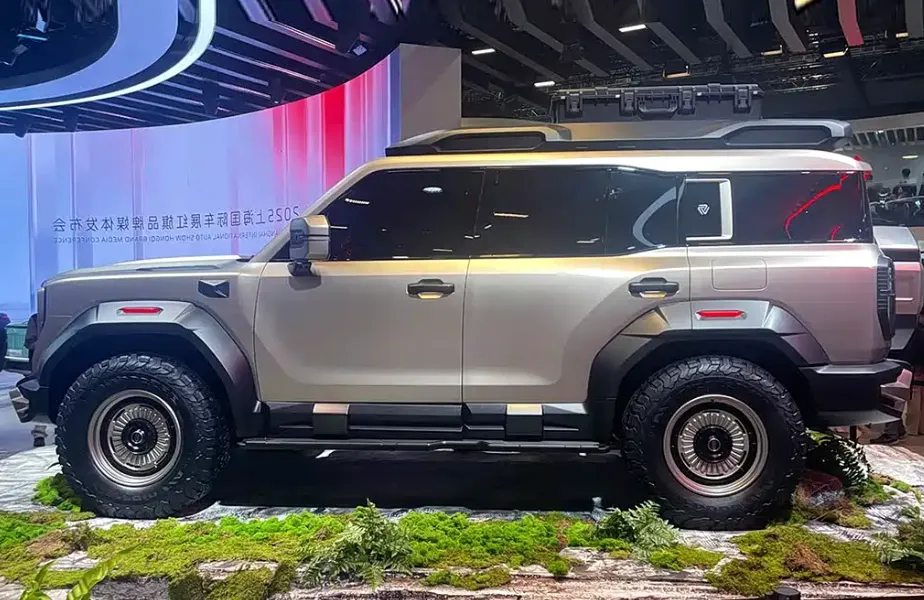 新车延续了概念车的方盒子造型,轮廓方正挺拔,车身高度足够,视觉上厚重又大气,完全符合硬派越野该有的气场,车长预计突破5.1米,妥妥的中大型SUV尺寸。