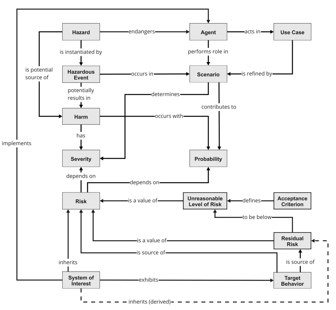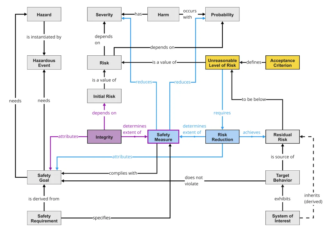 此外,本文沿用ISO 26262中的**安全目标(safety goal)**概念,即安全目标的制定需以危害和危害事件为依据,是顶层安全需求,同时包含必要的风险降低幅度和完整性要求。最终,由于目标系统的目标行为是残余风险的来源,其不得违反安全目标。