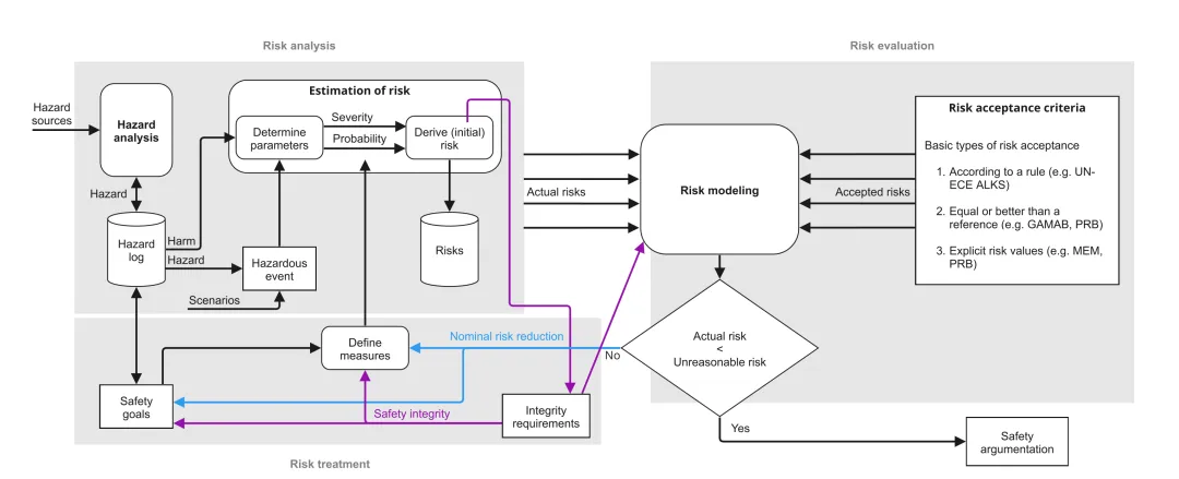 根据欧盟实施条例(EU)2022/1426,“自动驾驶系统制造商应制定接受准则,自动驾驶系统的验证目标由该准则推导而来,以评估其设计运行域(ODD)内的残余风险……”。然而,现行汽车安全标准(如ISO 26262和ISO 21448)仅在道路车辆安全生命周期中,为如何满足风险接受准则提供了隐性指导。这些领域专用标准将基础安全标准IEC 61508的指导原则应用于汽车领域。IEC 61508明确规定了风险管理活动,旨在将目标系统的残余风险降低至合理水平,而ISO 26262仅制定了一系列措施,默认这些措施能充分降低系统(或产品)的风险,却未对其进行显性说明。