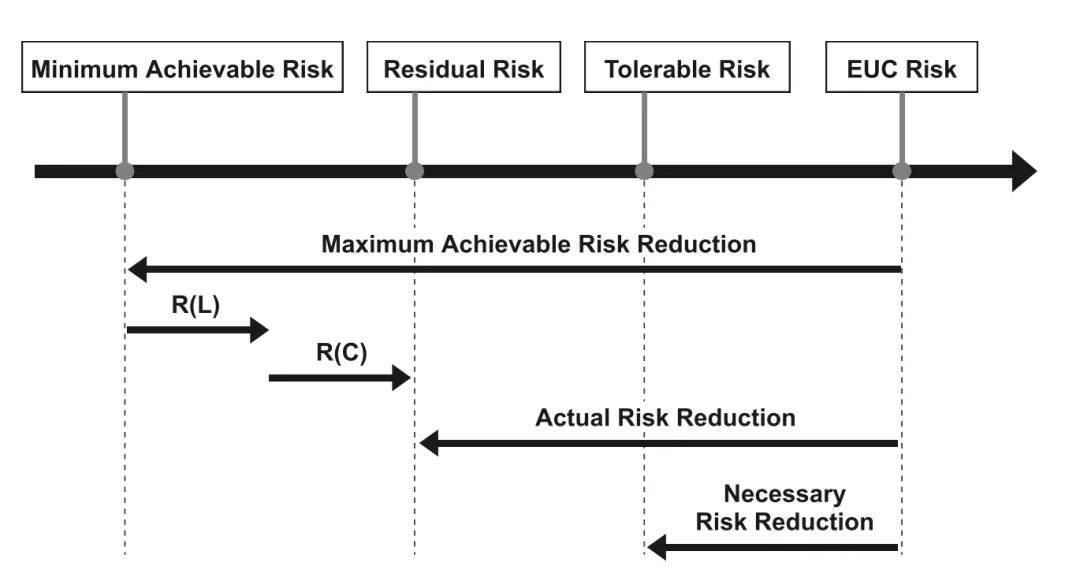 Fowler通过区分 “最低可实现风险”“残余风险”、“可容忍风险” 和系统的初始固有风险,直观展示了这些风险预算(参见图4)。最大可实现风险降低幅度决定了最低可实现风险,其假设安全功能无故障;随后,由于安全功能的完整性通常低于100%,风险降低效果会出现一定损失(参见图4中的R(L));此外,安全功能为目标系统增加了新的功能,其故障行为可能引发新的风险(参见图4中的R(C));最终,由这些风险影响因素产生的残余风险,必须低于不合理风险水平。