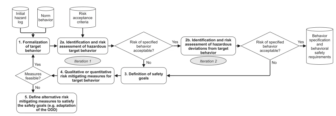 图5:基于风险的功能规范细化流程。为论证自动驾驶系统行为规范中不存在不合理风险,可通过基于风险的功能规范细化流程为该论证提供支撑。本研究所提流程的输出结果为一份行为规范,其中包含行为安全要求及其对应的完整性需求