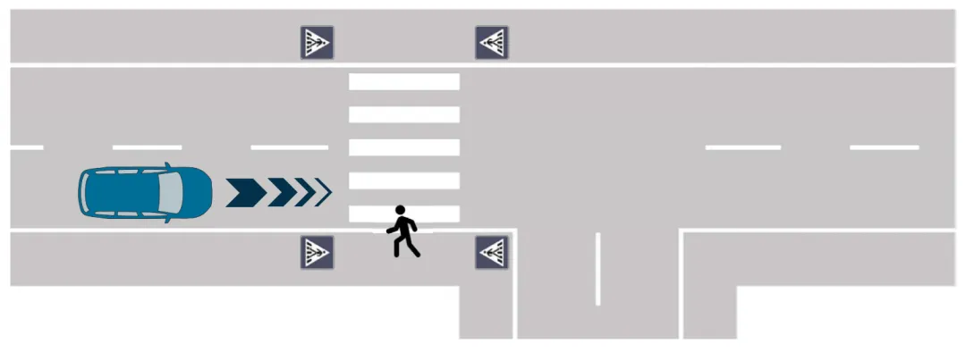 道路车辆在人行横道与弱势道路使用者(VRU)发生碰撞,可能导致弱势道路使用者受伤。