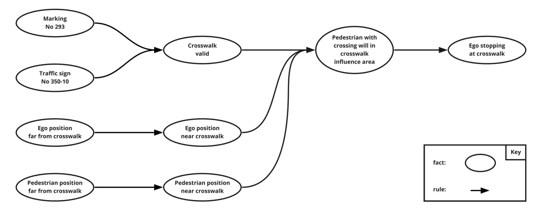 针对该示例安全目标,一项安全措施是将人行横道处行人的非规则过街行为纳入目标行为的形式化过程,并制定捕捉其过街意图的事实和规则。本文进一步假设,此类安全措施ⁿᵢ在技术上是可行的,现有先进的行人预测算法已能实现该功能。