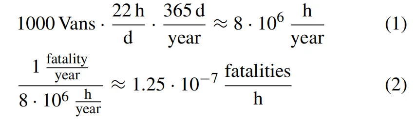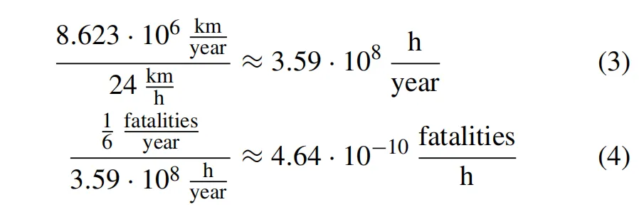 根据柏林参议院政府的数据,柏林城市道路的年行驶里程为 8.623×10⁶公里/年,平均车速约为24km/h;2006-2011年期间,柏林仅记录到1起行人在人行横道处死亡的事故。基于上述假设,本文首先估算柏林每年的总驾驶小时数,再量化当前柏林交通中每驾驶小时内人行横道处的行人死亡频率: