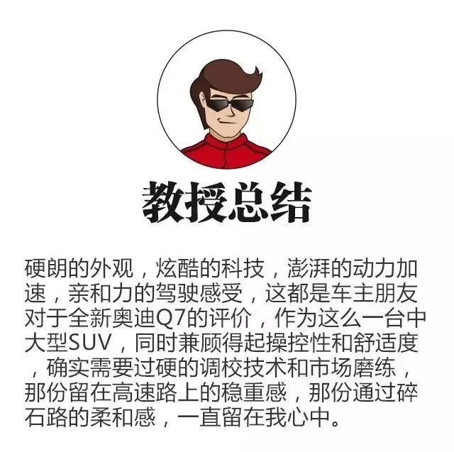 开过奥迪的车主认为奥迪车有个特点就是容易上手,好开。尤其是在这款全新奥迪Q7上,机械增压发动机的加速感并没有像涡轮增压一样带有迟滞,如果是快速踩油门急加速的话,所获得的动力可以很快爆发,而如果是慢慢踩油门在郊区的长途路上提速的话,则整体的车身姿态非常优雅,这时带给人的舒适感并没有减分。此外,在高速上驰骋时,车内的隔音效果还是非常的好,风噪和胎噪都被有效地隔离开来。