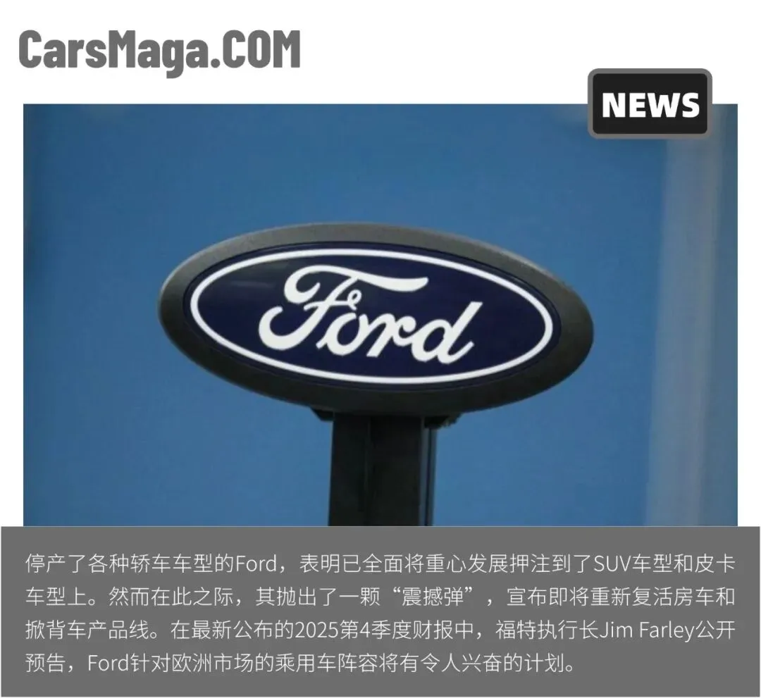 停产了各种轿车的Ford,表明已将重心发展押注到SUV和皮卡车型上。然而在此消息发布之际,对于车坛堪称引爆了一颗“震撼弹”,宣布即将重新复活轿车(Sedan)和掀背车(Hatchback)产品线。在最新公布的2025第4季度财报中,福特执行长Jim Farley公开预告,Ford针对欧洲市场的乘用车阵容将有令人兴奋的计划,并强调会在符合品牌优势的特定级别中谨慎布局。这也就意味着,Ford那些已经停产的轿车车型将会重新回归。