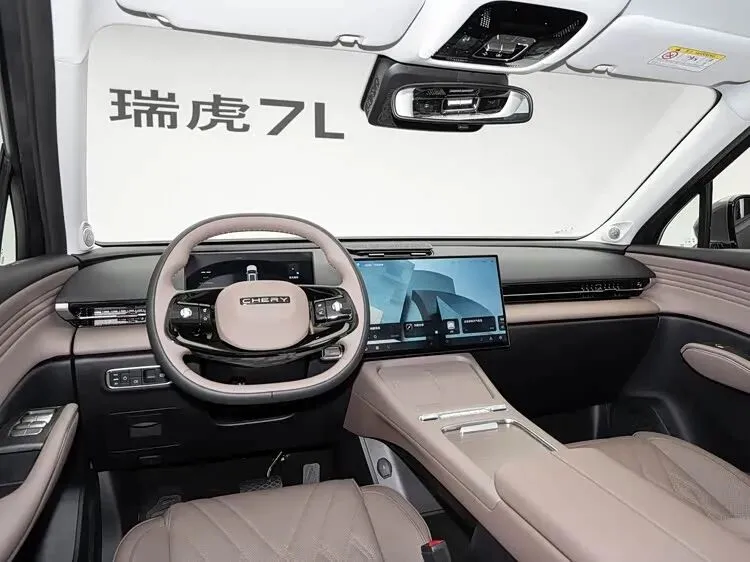 内饰方面,瑞虎7L采用了新的布局,中控台配备有悬浮式仪表盘和悬浮式中控屏。值得一提的是,其中控屏支持左右移动,屏幕后方设有滑轨,可以移动到副驾驶位置作为娱乐屏使用。车辆采用了怀挡设计(换挡杆位于方向盘后方),因此中央通道区域留出了更多的储物空间,设置了手机无线充电板和杯架,方向盘为双辐式多功能方向盘。