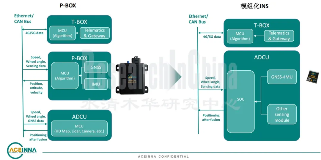 图8 GNSS+IMU在车载中的不同集成方式通过贴片式将高精度定位模组集成到域控里,可以减少数据传输,有效降低信息的延迟,提升高精度定位的精度。具体包括几类架构设计模式: • IMU集成于自动驾驶域控,GNSS放入T-BOX中; • 自动驾驶域控分别集成GNSS芯片和IMU模组; • IMU与GNSS组成INS模组,并集成到自动驾驶域控内; • 大疆惯导激目总成方案“激光雷达+视觉+IMU”集成,将GNSS芯片放入自动驾驶域控中。此外,IMU模组向自动驾驶域控集成,仍有一系列工程问题需要解决: • 时间同步:高阶智能驾驶车辆,对定位数据的实时性与精度有刚性需求。同时,定位的实时性不好,也会降低定位的精度; • 功能安全:智能驾驶域控制器由于集成了众多功能模块,系统较为复杂,而且通常为多核多进程的运行环境以及复杂的应用数据流,导致实现功能安全的难度大增,主机厂需要完整的RTK&INS 组合算法部署在域控侧的功能安全解决方案; • 温度补偿:IMU对温度变化非常敏感,将IMU、GNSS与域控集成在一起,需要考虑运行温度对产品的损害。