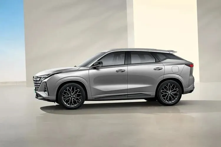前脸用了长安家族那种无边界的中网格栅,配上造型挺犀利的大灯,整个车头看起来挺宽、挺有力量感。侧面是悬浮式车顶的设计,线条往下压,带点运动感。车尾则是现在流行的贯穿式尾灯,底下还做了双边排气的装饰,年轻味儿是给足了。