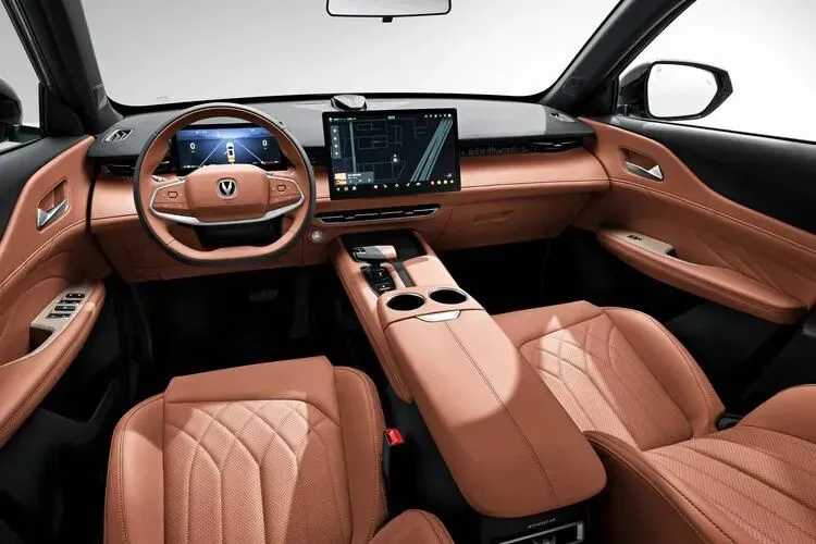 整个内饰是那种棕色调的,看着有高级感,不像一些廉价车那样全是黑塑料。中控台上一块14.6英寸的大屏幕,里面集成了大部分功能,支持语音控制,反应速度也还可以。