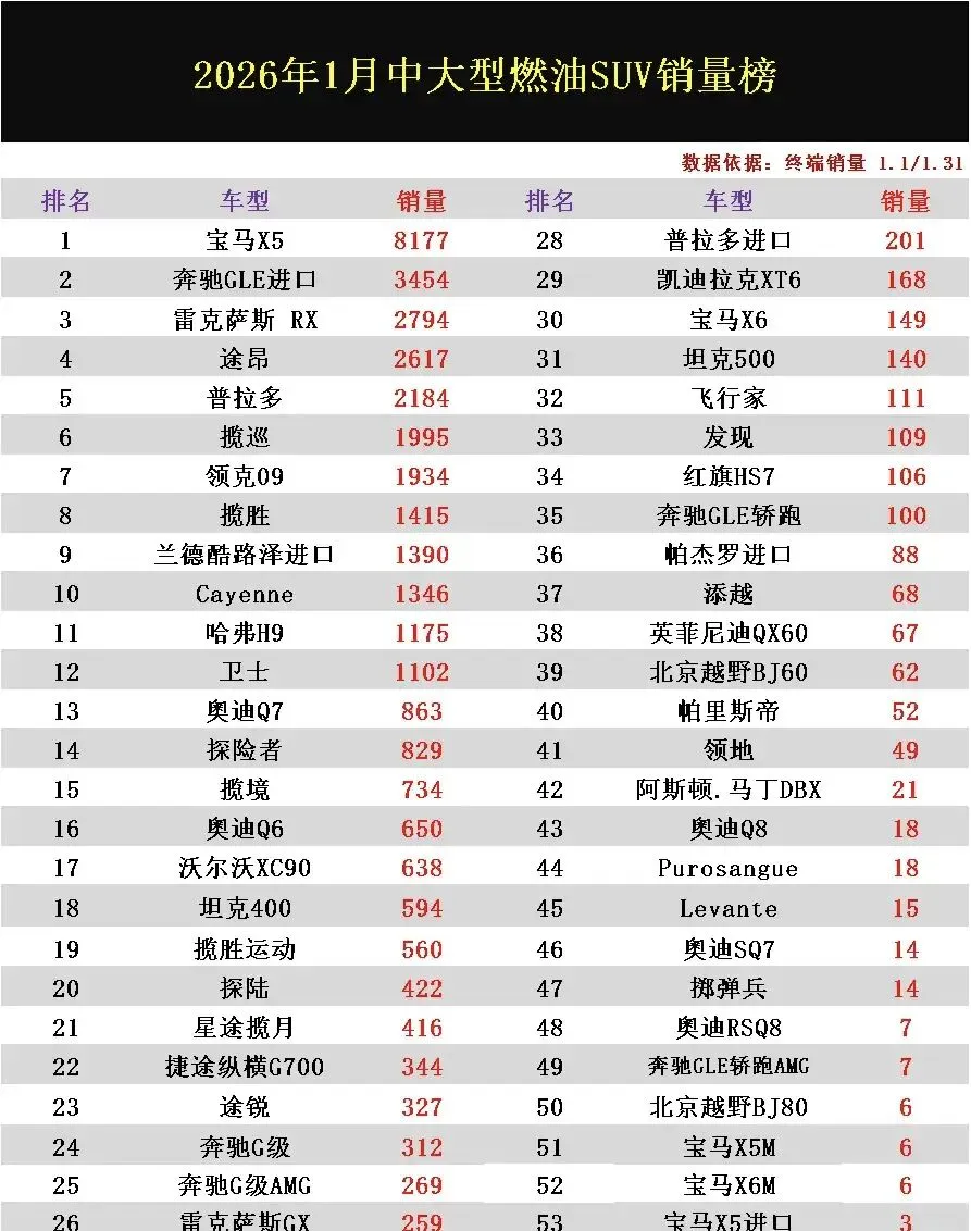 导读:近期,2026年1月中大型燃油SUV零售量排行榜已正式公布了!从榜单数据来看,这一细分市场的销量表现整体较为低迷,在上榜的54款车型里面,竟然无一款月销量突破万辆大关,而且不足千辆的车型高达40款以上。其中排名第一的宝马X5则以8177辆的销量再次领跑市场,奔驰GLE进口意外拿下第二,交付量为3454辆,与第一名销量相差接近5千辆,雷克萨斯LX位居第三,途昂、丰田普拉多都进入前五,揽巡、领克09、揽胜、兰德酷路泽等车型排名虽然依旧靠前,但销量均勉强突破千辆。整体来看,国内新能源车型的崛起对于高端传统燃油车来说,冲击力可谓是十分巨大的,市场销量整体表现一般就是最好的证明。真惨!1月中大型燃油SUV销量榜:无1款破万,途昂第4,探险者第14