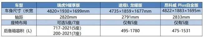 大众途观L龙耀版的尺寸为4735×1859×1677mm,轴距2791mm。车身宽度为1859mm,比瑞虎9耀享版窄了71mm,车长和车高也稍显逊色,而且全系5座布局。其后备箱的容积为495L—1780L,虽然能放下基础的行李物品,但面对大家庭出行的多重装载需求时会显得有些局促,往往需要进行取舍,才能保证后排乘客的乘坐舒适性。