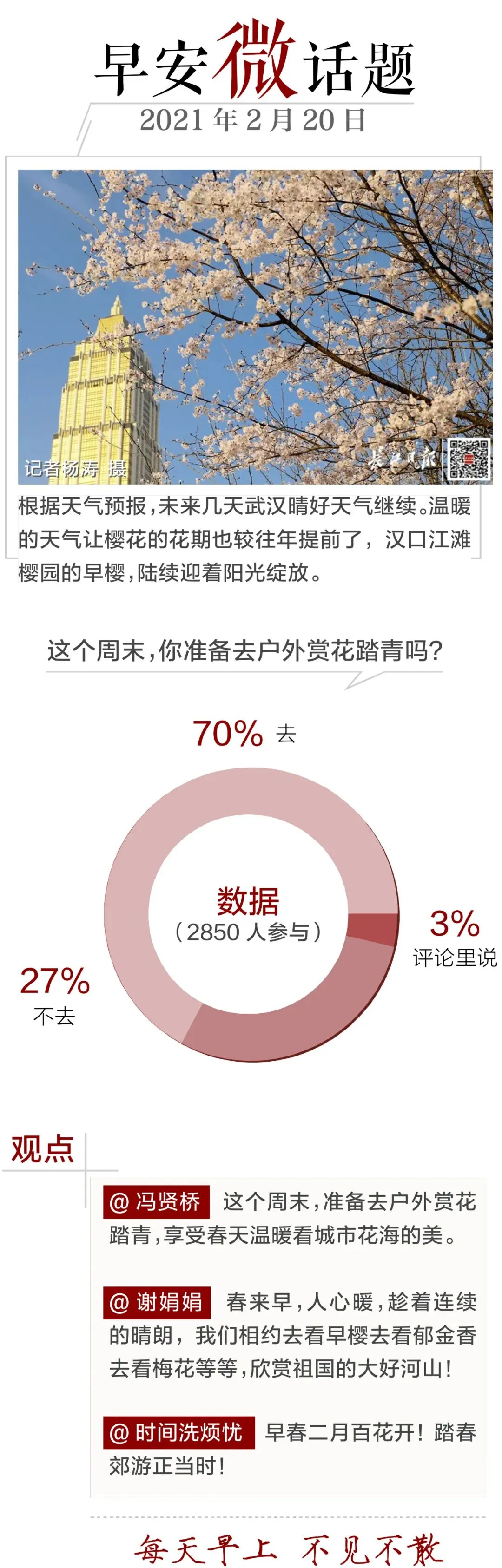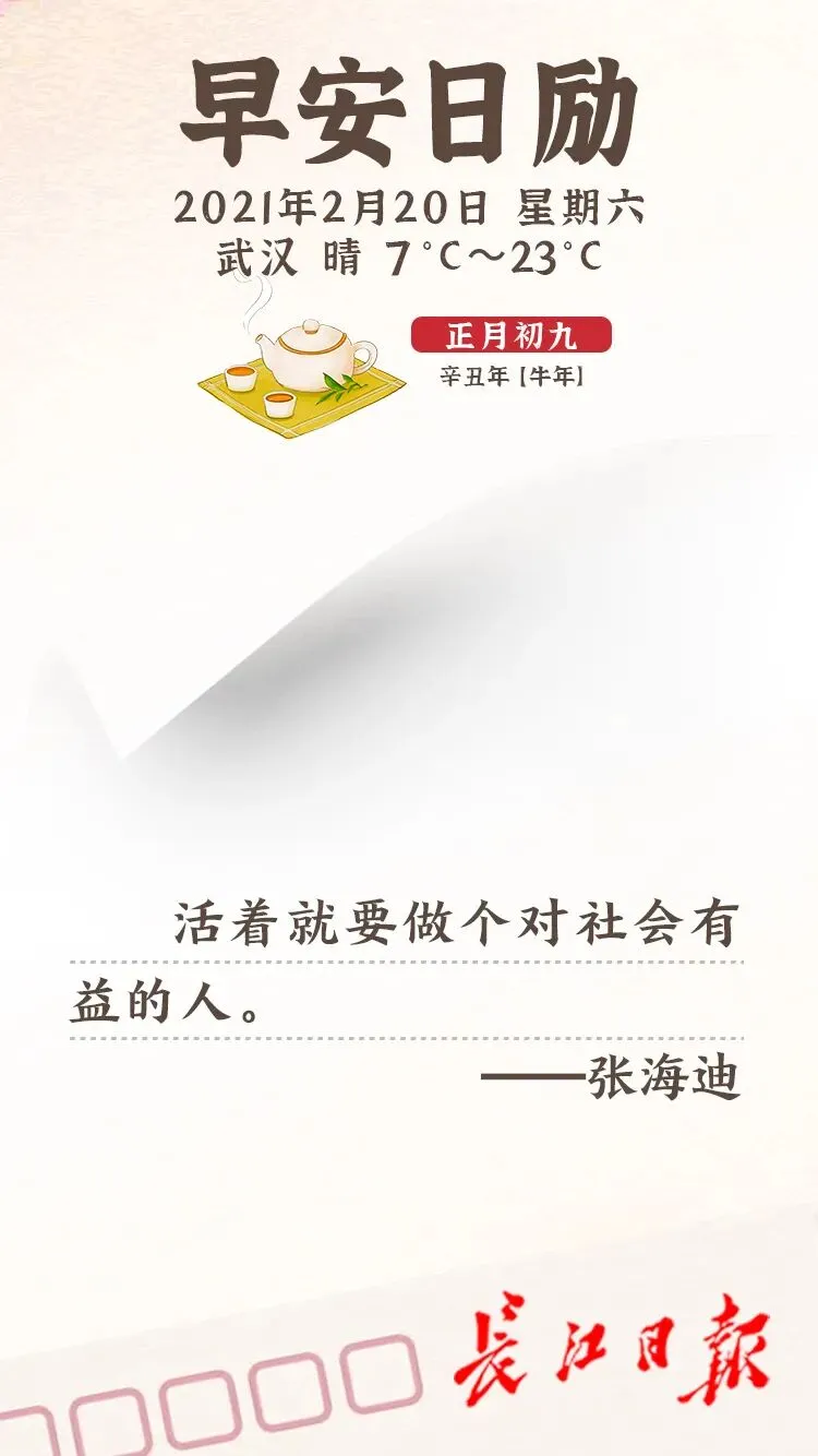 ◇ 297个摄像头,10组可视报警求助灯杆——春节期间,武昌区紫阳公园人流量大增,因为这套全新智慧寻人系统,34位在园内游玩走失的小朋友第一时间回到家人身边。◇ 19日,武汉足球俱乐部宣布与老队长姚翰林续约成功。作为湖北武汉职业足球史上效力时间最长的现役球员,姚翰林继续牵手武汉队的消息一经公布,立刻得到了广大球迷支持。◇ 今天武汉晴暖依旧,气温在7℃~23℃之间。预计未来三天,我市天气持续晴朗,气温上升。不过,天气在下周将有“大反转”,雨预计在下周三、周四前后到来。◇ 国家药监局19日披露,目前已附条件批准我国2个新冠病毒疫苗上市,应急批准16个疫苗品种开展临床试验。