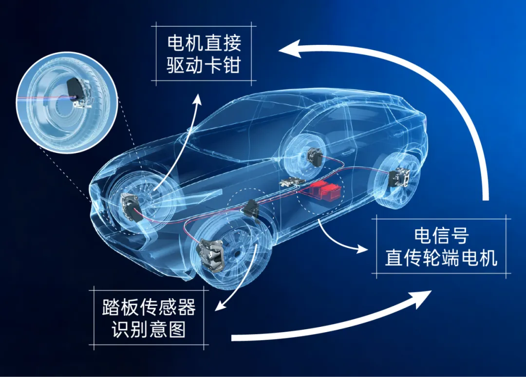 如果变成全线控制动,路径则变得更加简单:踏板传感器识别意图→电信号直传轮端电机→电机直接驱动卡钳。