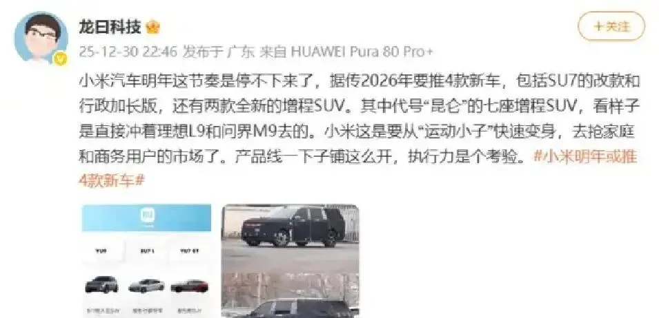 小米要搞大事了!不是手机,不是电动车,是豪华SUV。内部代号“昆仑”,2026年4月上市,直接把宝马奔驰吓出冷汗——这哪是造车,分明是给豪车市场扔了颗核弹。