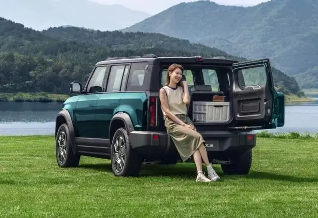 侧面看这车,离地间隙表现不错,轮高比达到了 2.35,说明姿态够高,视野也开阔。尾部延续方盒子造型,采用侧开门设计,开启角度达到 89.8度,开口面积极大,装卸货物或者野外露营搭配折叠桌椅,这个开口简直是神来之笔,整体越野氛围感直接拉满。