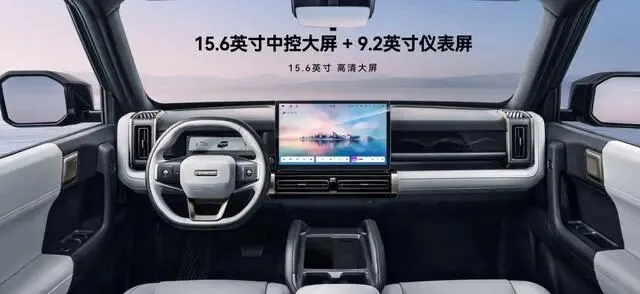 内饰配置堆料也相当猛。中控配备 15.6英寸大屏,行车电脑屏幕 9.2英寸,芯片用的是高通骁龙8155,这颗芯片在智能手机领域属于旗舰级别,用在车机上流畅度有保障。内饰大面积软包覆盖,档次感提升不少。语音识别系统支持四驱控制,意味着你可以直接喊一嗓子切换驾驶模式,不用手动操作,这个细节在越野场景里很实用。