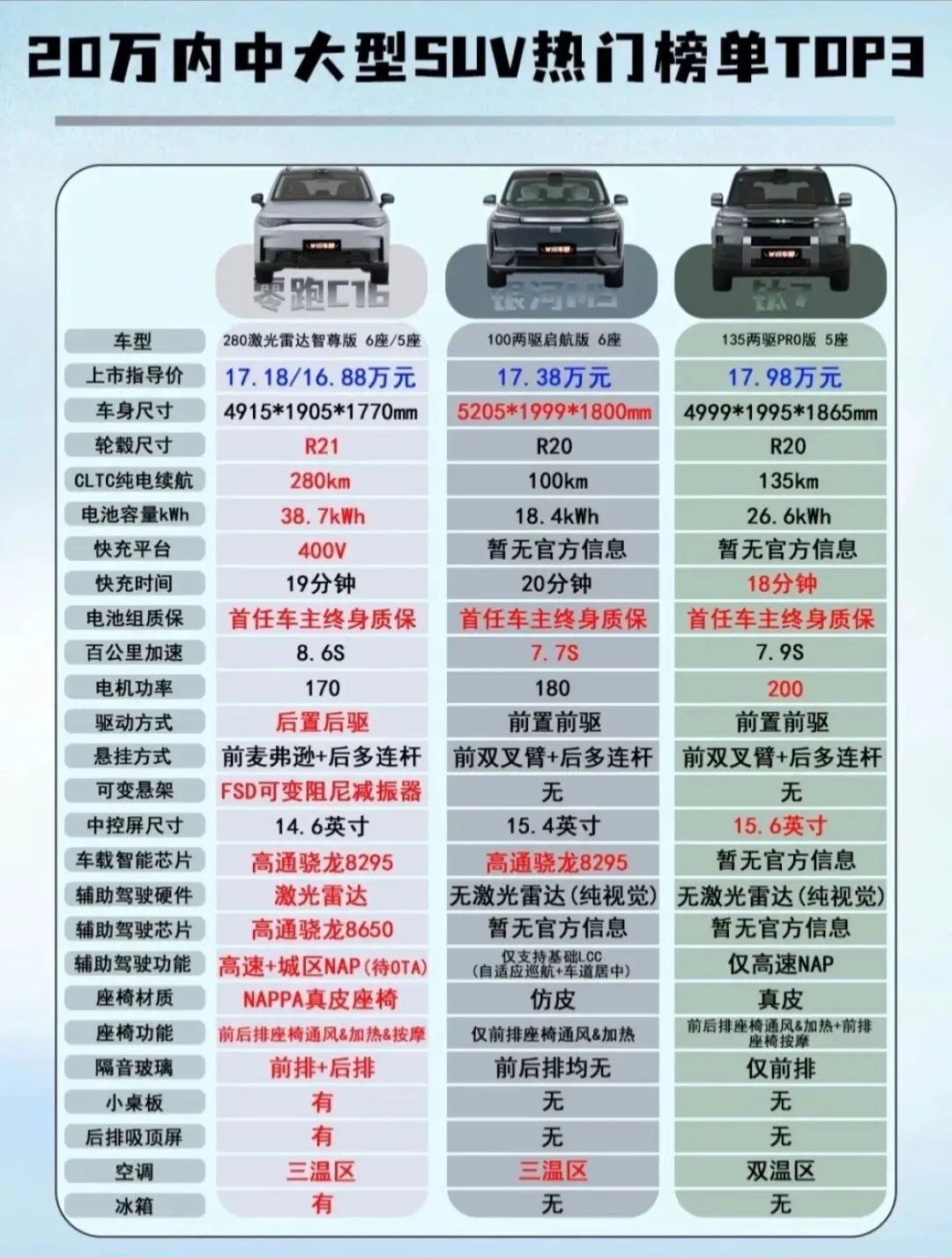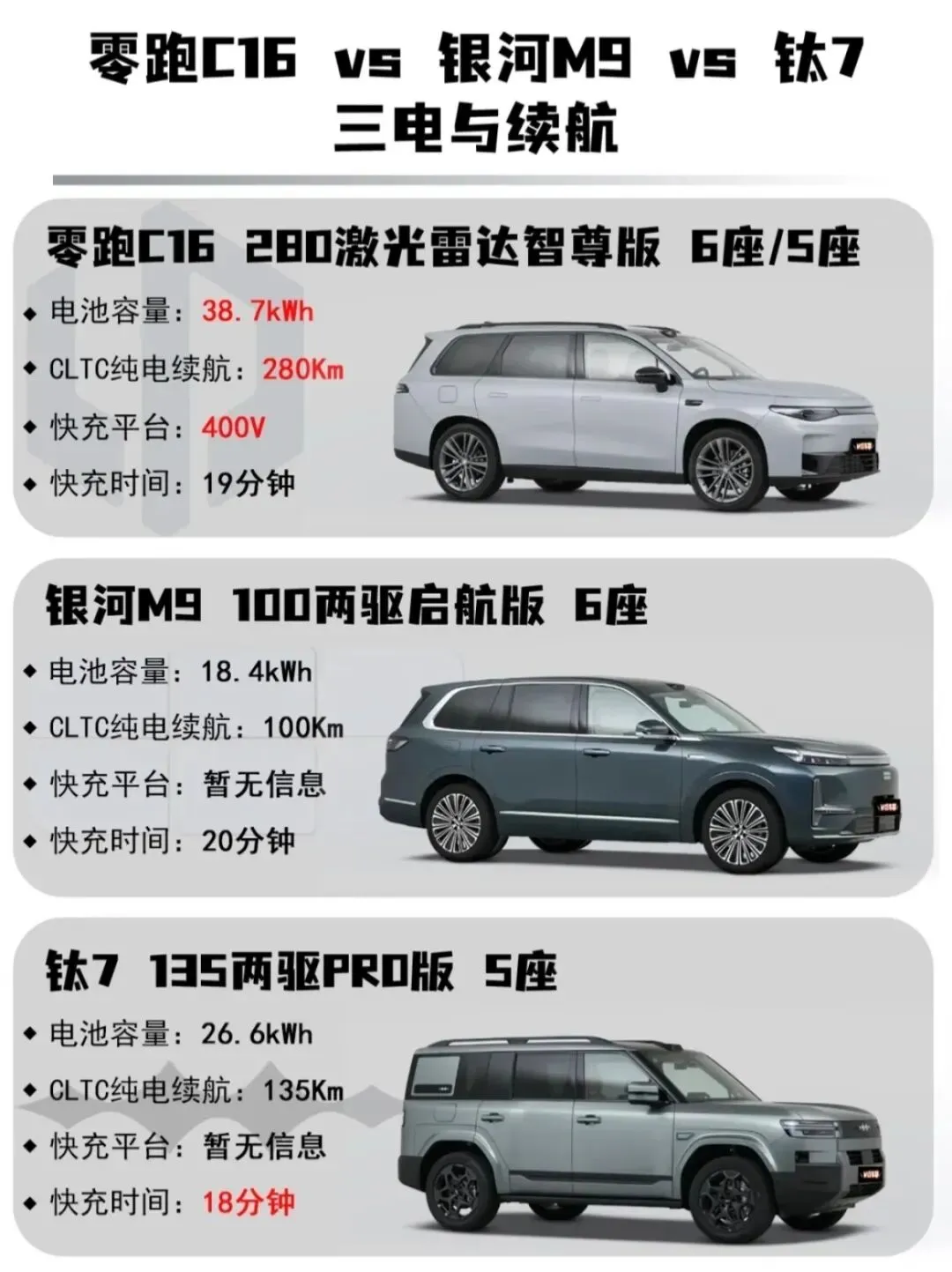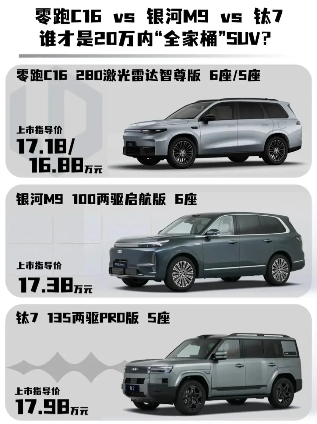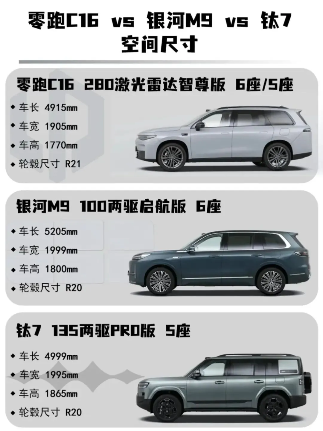 今天我就拿中大型SUV热门车型:零跑C16 280激光雷达智尊版6座/5座、银河M9 100两驱启航版6座、钛7135两驱PRO版5座做对比。看看哪一款才是最符合你的用车需求呢?