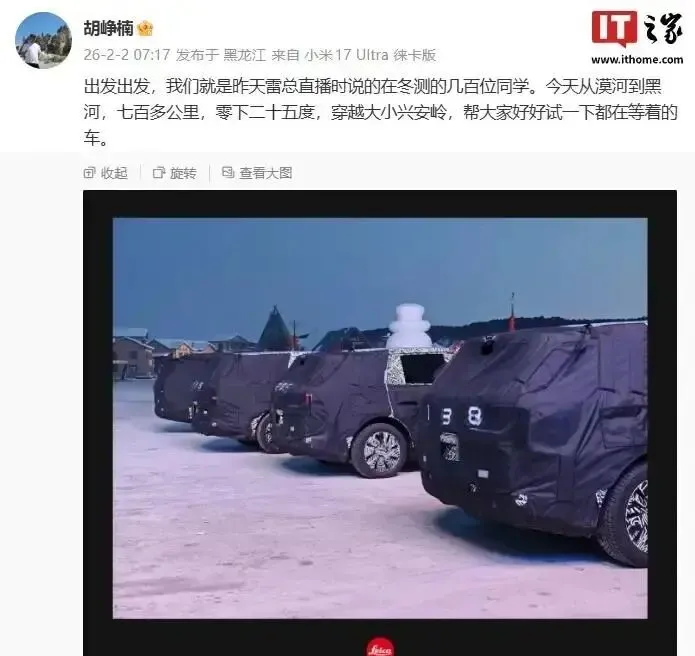 昨天网上疯传的谍照,小米首款增程全尺寸SUV(代号“昆仑”,暂叫YU9)伪装层直接扒光了。水滴后视镜、竖状尾灯、那个传说中的“天地门”后备箱,全暴露在阳光下。顺为资本的胡峥楠2月2号就发过实拍图,就一句:“都在等着的车。”小米副总裁张剑慧更绝,微博甩出个小蓝灯点亮的动态视频——上车!这哪是测试,分明是催命符:兄弟,你等的车,真来了。