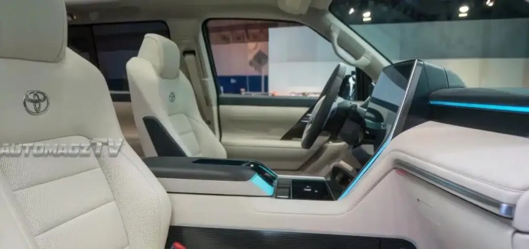 内饰方面,全新丰田兰德酷路泽 EV 整体采用对称式硬派豪华座舱布局,中控台大面积采用软质材质包裹,搭配细腻缝线与金属饰板,兼顾硬派气息与豪华质感,12.3 英寸液晶仪表 + 16 英寸中控屏组成双联屏,搭载丰田最新智联系统,支持语音控制与无线 CarPlay 连接,全系标配 L2 级驾驶辅助系统、360 度全景影像、3.3kW 外放电与越野蠕行模式,越野与家用配置全面拉满。不过差速锁等越野功能集成在中控屏内,戴越野手套操作不如机械按键方便,是内饰上的明显短板。