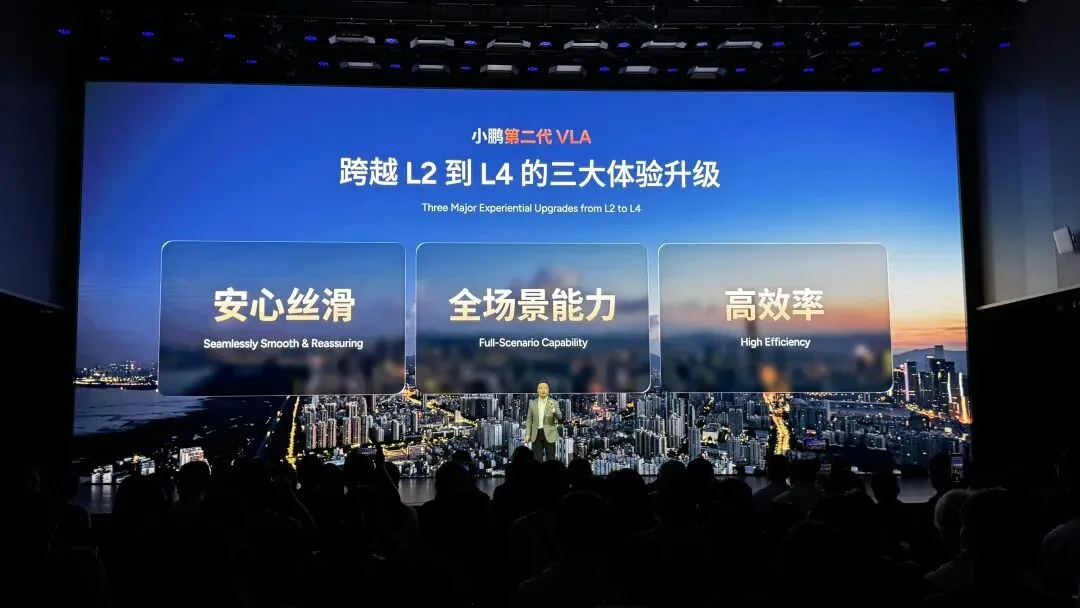 何小鹏表示,第二代VLA在安全、全场景能力、高效率方面有所提升。安全方面,第二代VLA具备识别各种异形车辆、绕行事故现场、起伏烂路提前降速、夜间礼让小动物等能力;全场景能力方面,覆盖园区小路、乡村土路及无导航道路等复杂场景;效率方面,据小鹏方面介绍,其通行效率比传统L2智驾和Robotaxi都快,驾驶效率比肩人类老司机。