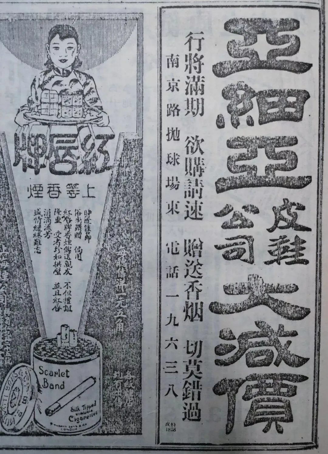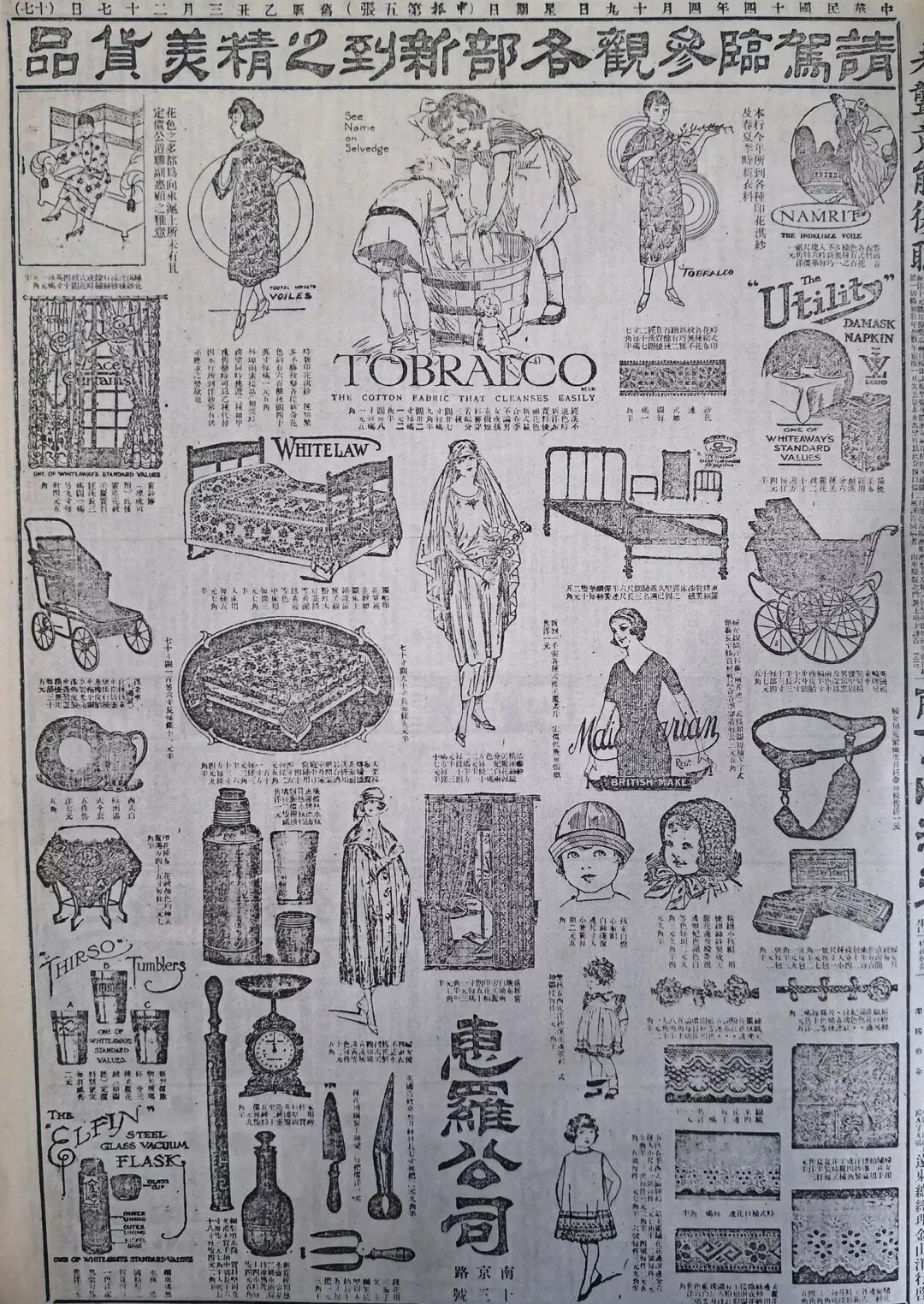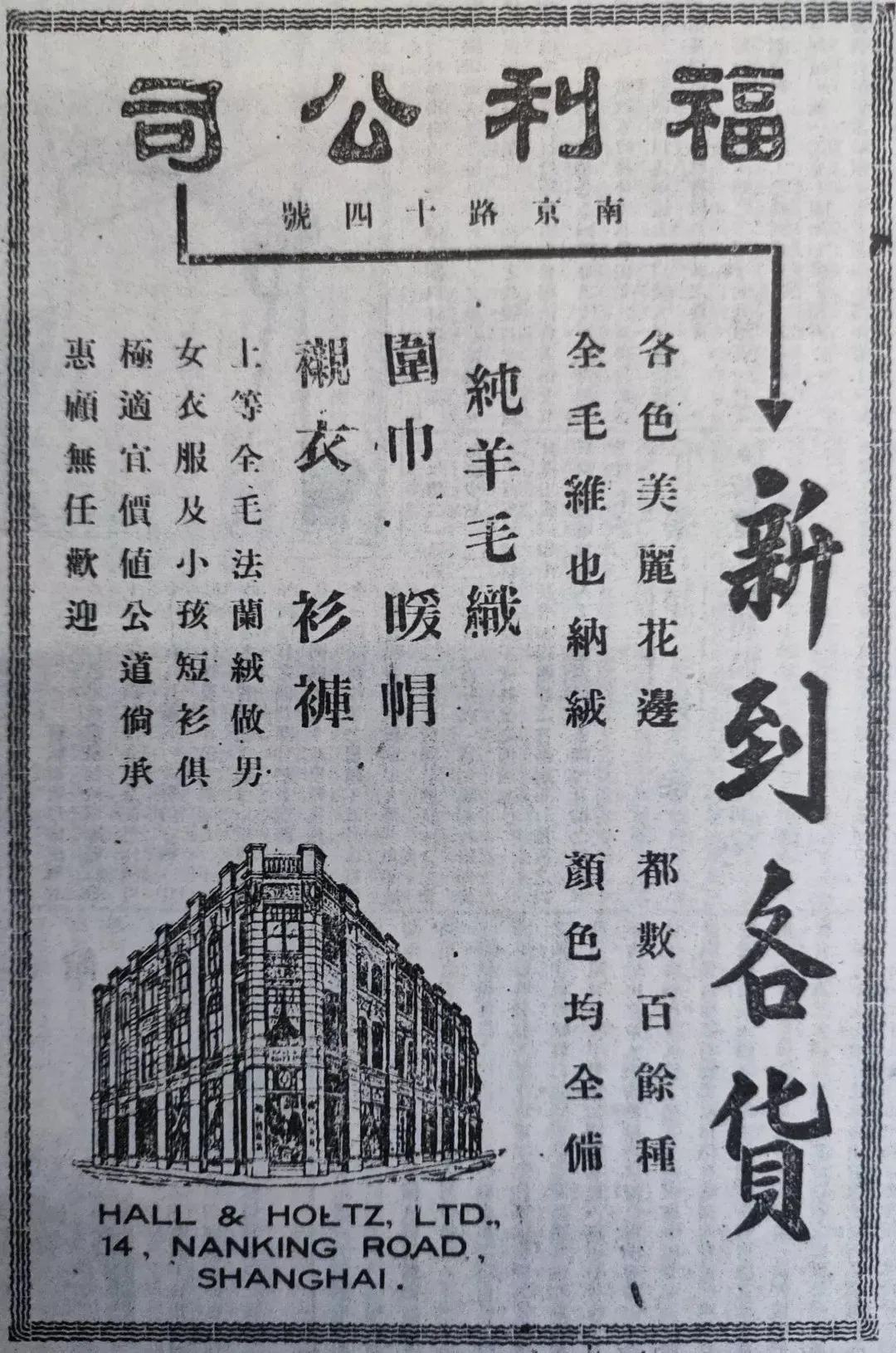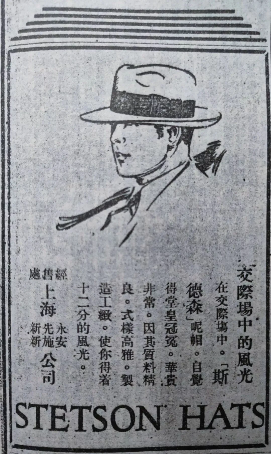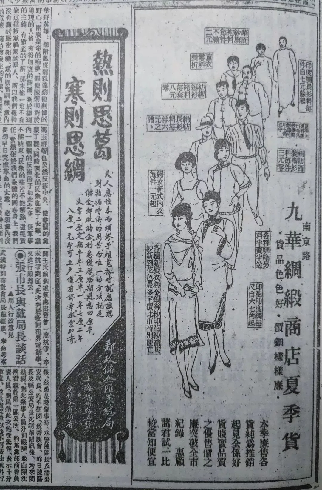1920年11月14日福利公司新到各货“各色美丽花边”。 1926年10月23日斯德森呢帽“冠冕堂皇,华贵非常”。1930年6月16日九华绸缎商店“货品色色好,价钿样样廉”。1934年6月23日中国内衣公司翻领装“凉爽·便利·耐穿·经济!”1930年5月30日亚细亚公司皮鞋“行将满期,欲购请速”。用