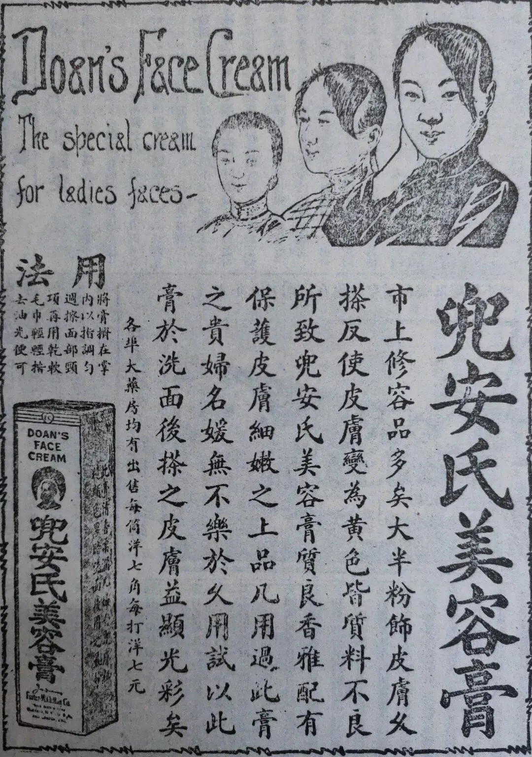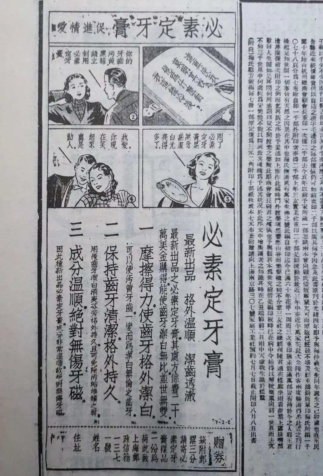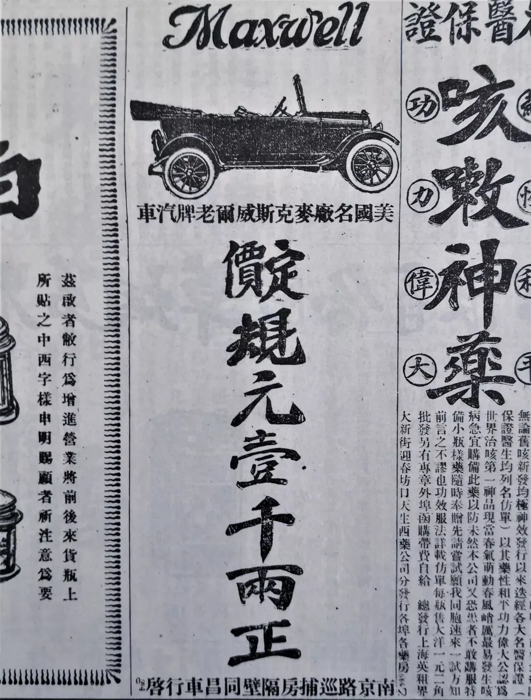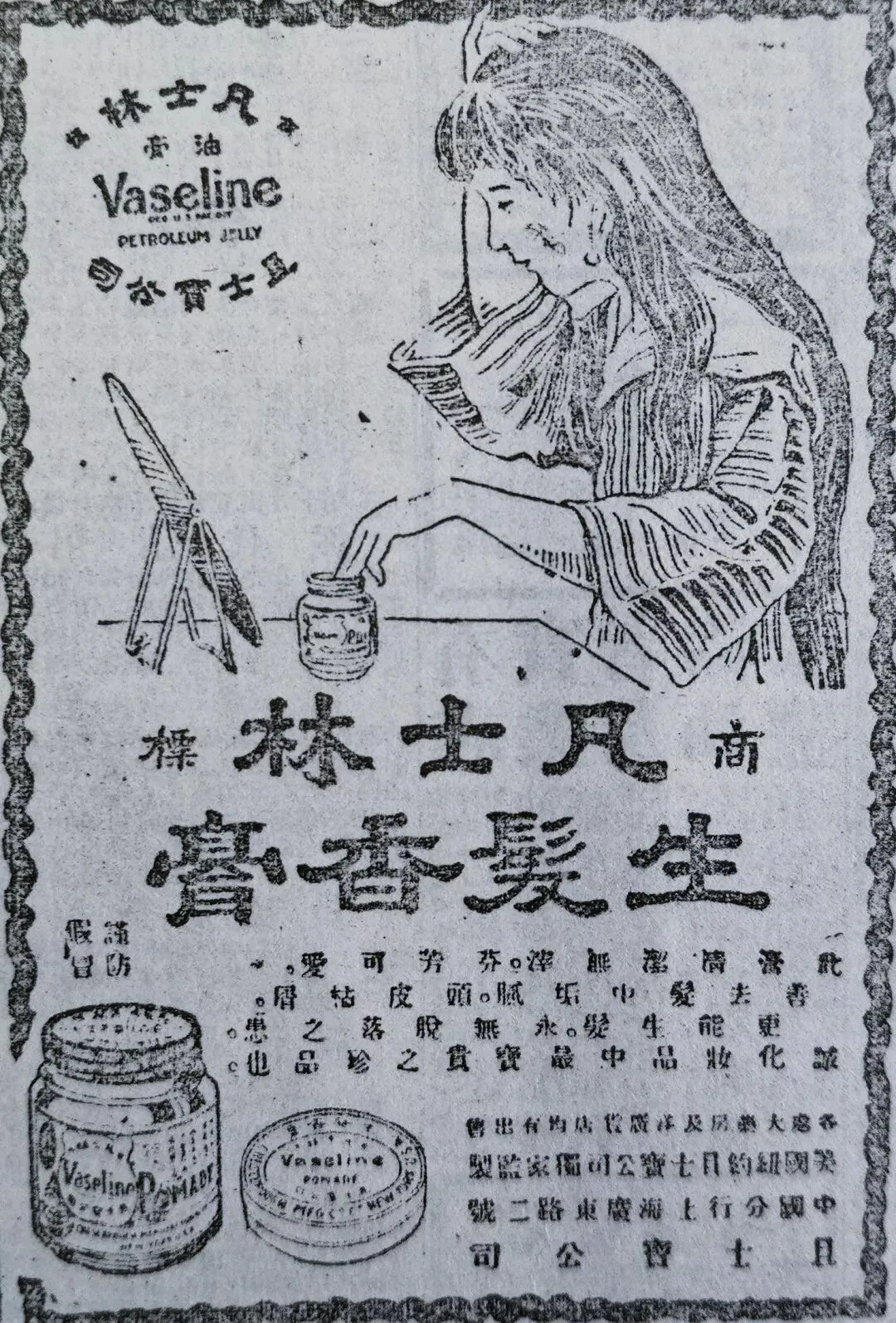 1927年12月1日所梳敦恃牙膏、爽牙水、牙粉“保能齿齿洁白,永无腐朽之患”。1925年4月19日凡士林生发香膏“能生发永无脱落之患”。1936年6月20日力士香皂“明星用之美容的香皂”。1920年11月14日兜安氏美容膏“皮肤益显光彩矣”。1930年6月22日美国蔻丹修指用品“彼妹之手,若干枯粗黯,则虽光辉四射之钻戒,不足以助其美”。1937年6月18日双妹老牌爽身粉、花露水“深闺姊妹应珍重,到处衣香惹蝶怜”。1929年6月22日夏士莲雪花膏“容颜的美是每个妇女最渴望得着的”。1937年6月19日必素定牙膏“促进爱情”。1926年6月3日杀虫药水“蟑螂虽毒,吾人可高枕无忧”。1933年4月5日冠生园饮食部鲜明虾“暮春时节以此为下酒物其风味盎然矣”。1930年1月22日冠生园糖果年糕礼品市场“新增欧式果盘”。1925年10月15日飞鹰老牌炼乳“强身健力,老幼咸宜”。1930年1月23日三桶牌三星白兰地“风行全球数十余载”。1923年1月15日果汁牛肉“中外人士,皆配胃口”。1933年6月20日正广和汽水“请畅饮之,卫生有益”。1937年6月18日正广和汽水“大众需要之饮品”。1921年5月9日红色清道丸“阁下之口气惹人厌恶否”。1922年11月4日艾罗补脑汁“世界愈文明,生存竞争愈剧烈”。1932年6月19日克雷斯香烟“漂亮名媛爱吸克雷斯香烟之一斑”。1921年11月25日金马牌香烟“香烟之有金马,犹诸鸟有凤而鱼有鲲”。亨茂汽车公司1926年9月3日在《申报》上的广告:“真正的愉快不是常可以得到的。君若购壁克汽车一辆,就可以时常得到真正的愉快。”1925年4月18日《申报》刊登的马斯律汽车广告:“随时随地无不适用。”1934年3月12日道奇车的整版广告:“去年11月17日道奇全钢独幅车身保全四命”,还配上了名人乘坐道奇汽车的留影照片。1921年2月27日,麦克斯威尔汽车的广告仅用超大字号标注价格,没有多余的标语,主要还是用漫画突出其敞篷车型。福特汽车1926年9月3日在《申报》上的漫画还画出了驾驶员和街道,更加有画面感。1921年2月8日,前后出现的出租汽车广告和汽车修理广告。